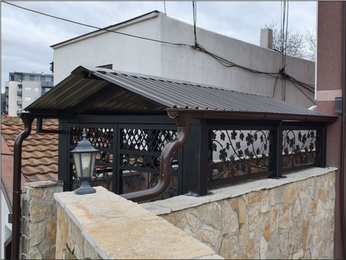 | Kapija – Ulaz u zgradu. Konstrukcija je izrađena kao kombinacija kovanog gvožđa (kapija i zaštitna ograda), šupljih kutijastih profila (konstrukcija krova) i plastificiranog trapeznog lima (krov i oluci). |