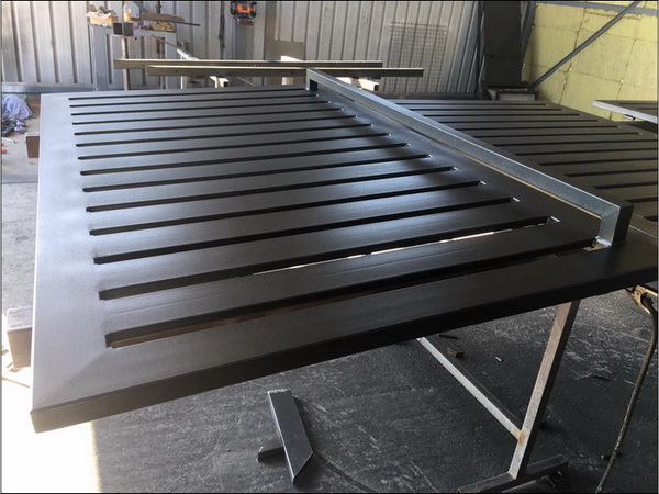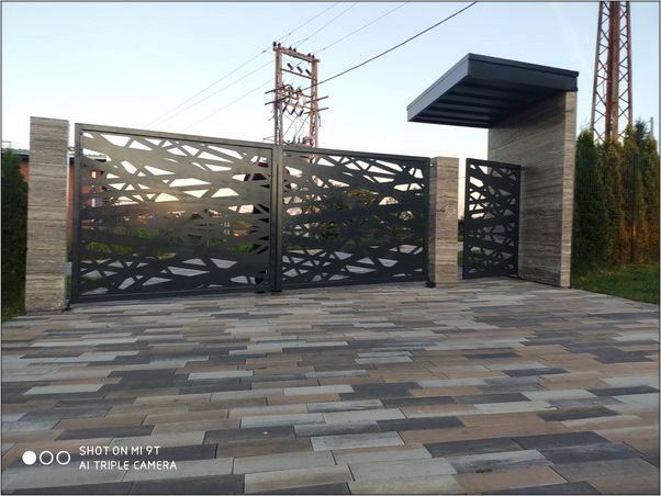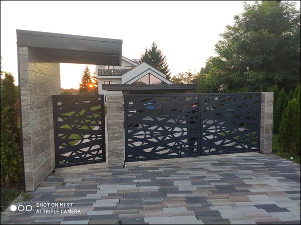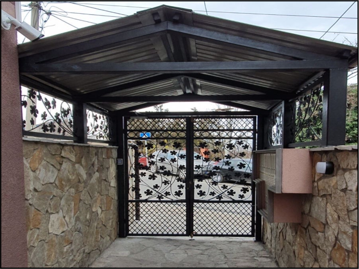 Dvokrilna kapija sa dodatnim vratima za pešake. Kapija je napravljena od čelinih šupljih profila spojenih zavarivanjem, sa ispunom od čeličnog lima, koji je pripremljen na laseru.
