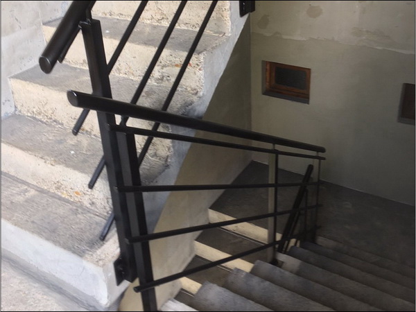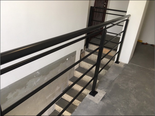 Zaštitna ograda za stepenište stambene zgrade. Ograda je napravljena od čeličnih cevi koje su spojene zavarivanjem.